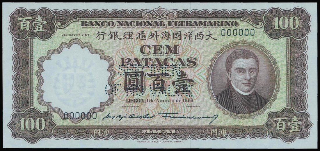 Banco Nacional Ultramarino, 100patacas, 'Specimen', 1966, serial number '000000', green and brown, Da Silveira at right, watermark of coat of arms at left, 'SPECIMEN OF NO VALUE' perforated, archway with flag at centre on the reverse,