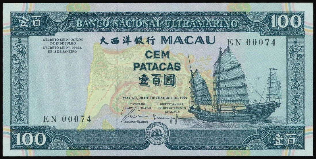 Banco Nacional Ultramarino,100 patacas, 1999, low serial number EN00074,gray blue on multicolour underprint, junk at right, watermark at left, reverse gray blue, city view and bridge in field,