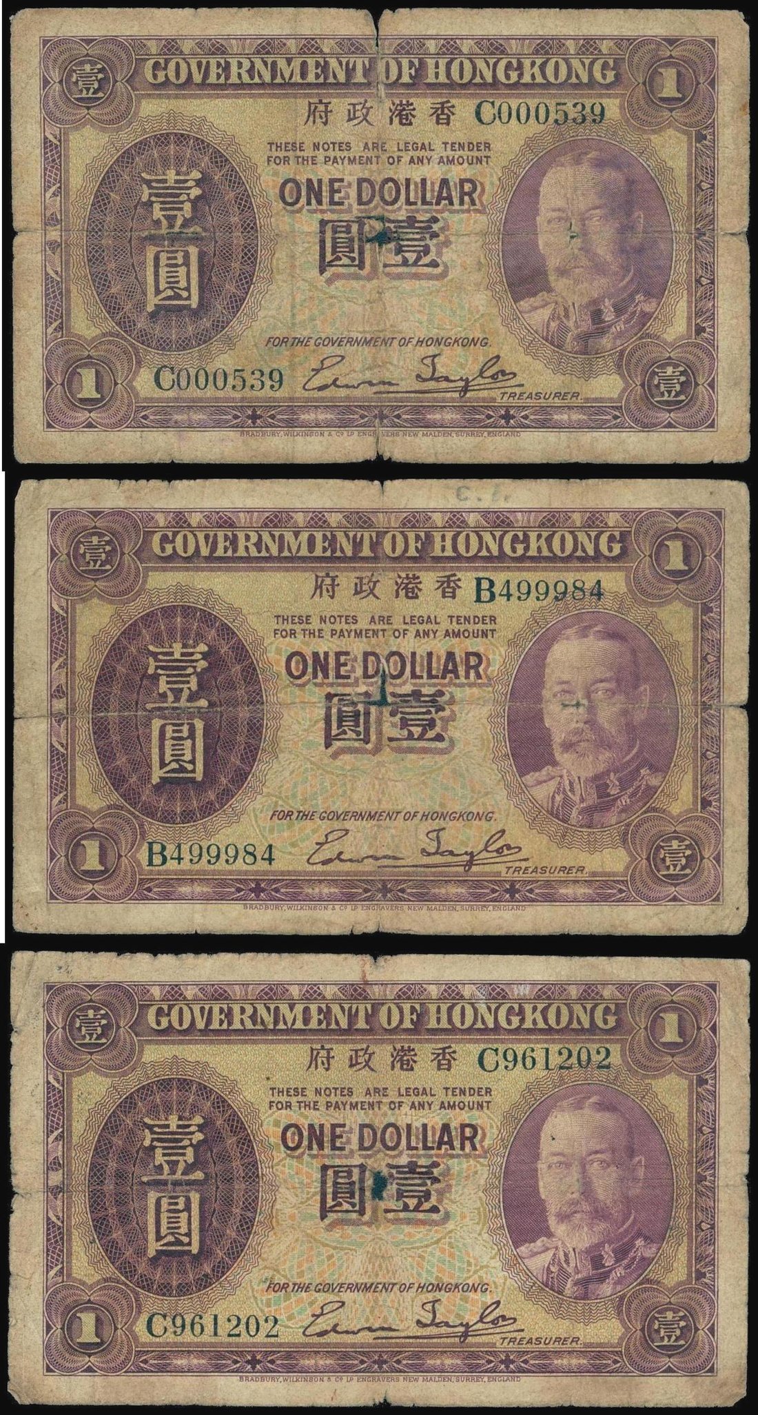 Hong Kong Government,a lot of three $1, ND(1935), purple, George V at right, value at left, reverse purple,