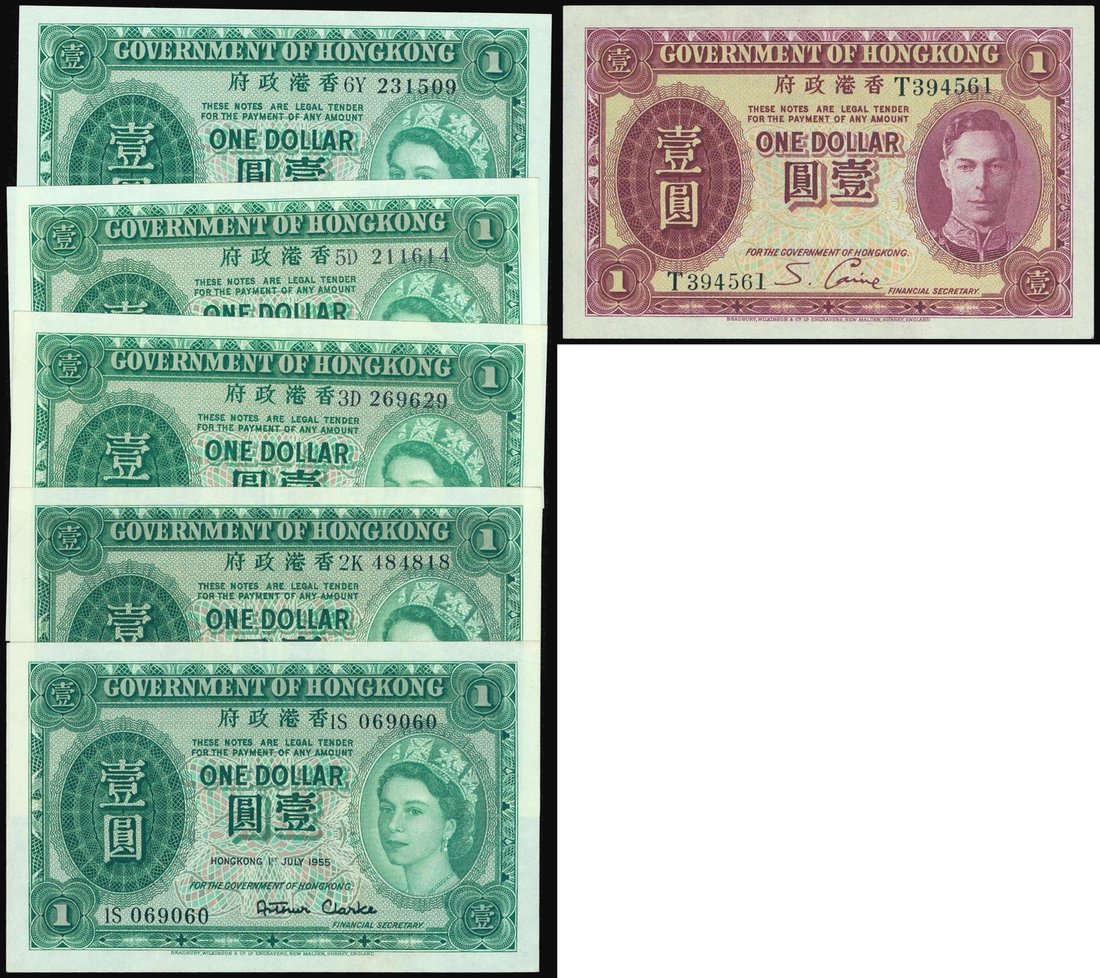 Government of Hong Kong, group of 6x $1, 1936, 1955 to 1959, (Pick 312, 324A), the 1936 is almost uncirculated and the 1955 good very fine, the rest good extremely fine to almost uncirculated (6).