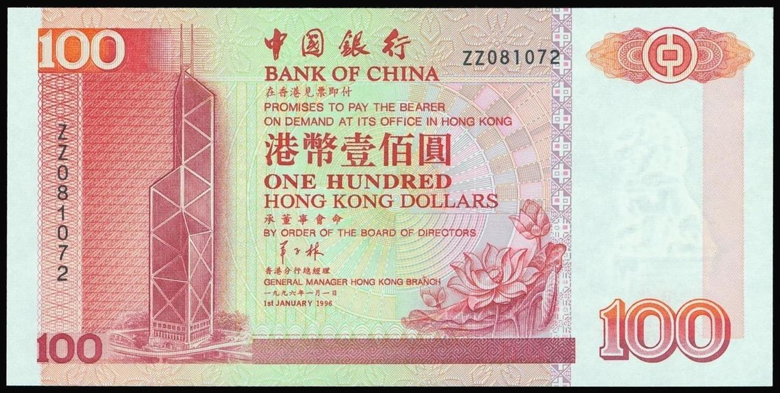 Bank of China,$100, 1 January 1996, ‘Replacement’ note, serial number ZZ081072,red on multicolour underprint, bank building at left, watermark of stone lion at right, reverse red and multicolour, view of Kowloon,