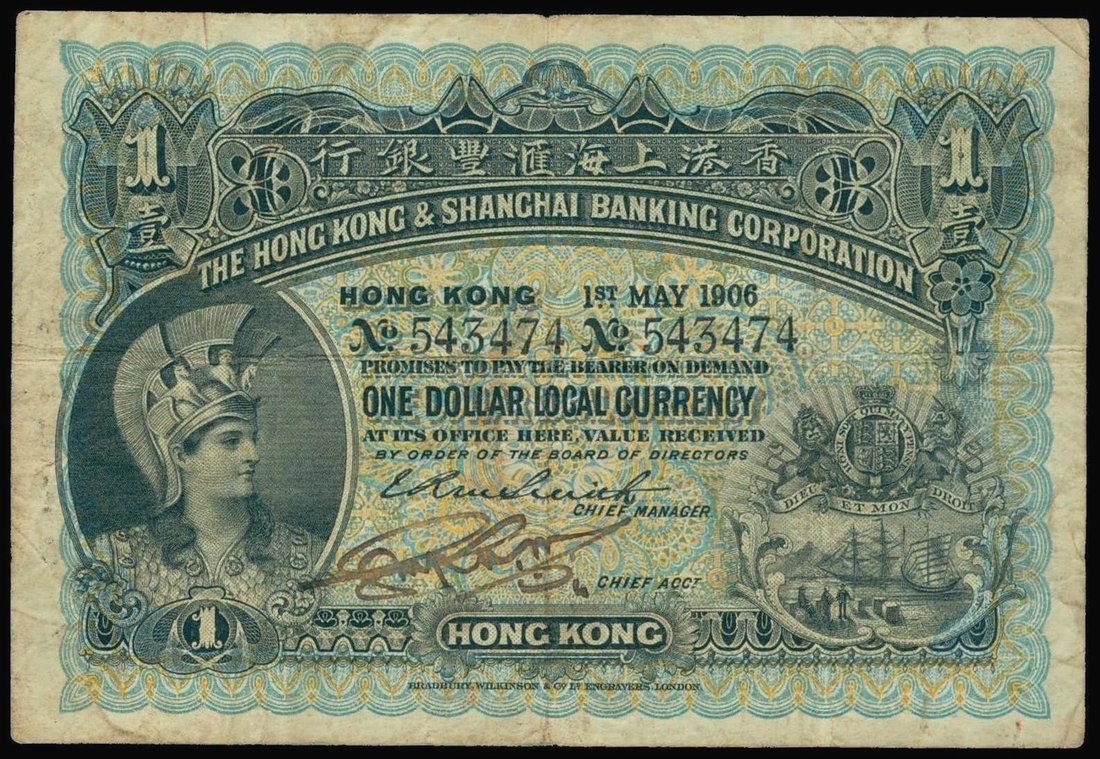 The HongKong and Shanghai Banking Corporation, $1, 1906, serial number 543474, blue and multicoloured, helmeted head of Minerva at left, two printed signatures below, reverse purple, maiden centre,