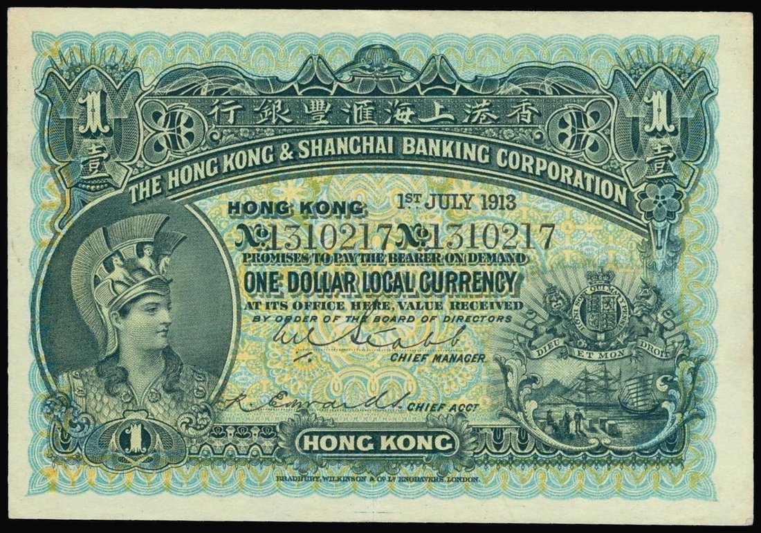 The HongKong and Shanghai Banking Corporation, $1, 1.7.1913, serial number 1310217, blue and multicoloured, helmeted head of Minerva at left, two printed signatures below, reverse purple, maiden centre,