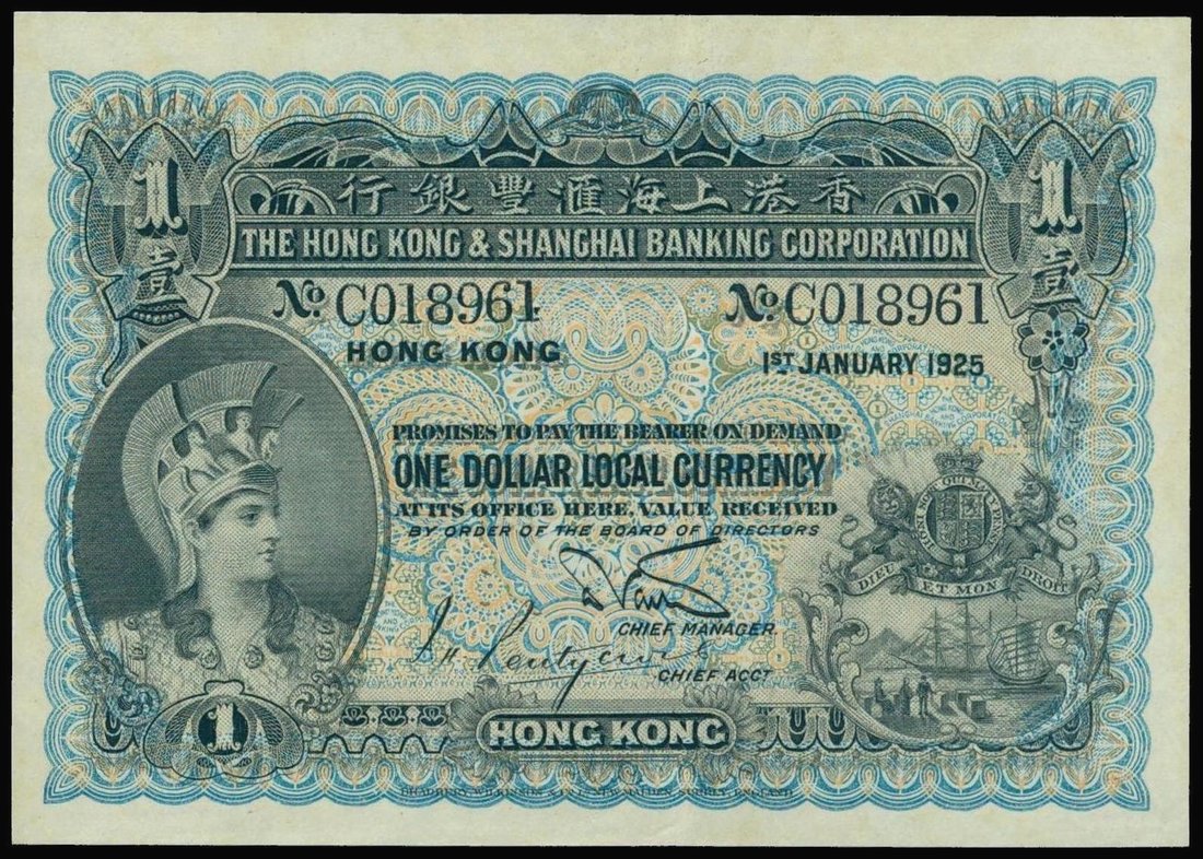 The HongKong and Shanghai Banking Corporation, $1, 1.1.1925, serial number C018961, blue and multicoloured, helmeted head of Minerva at left, two printed signatures below, reverse purple, maiden centre,