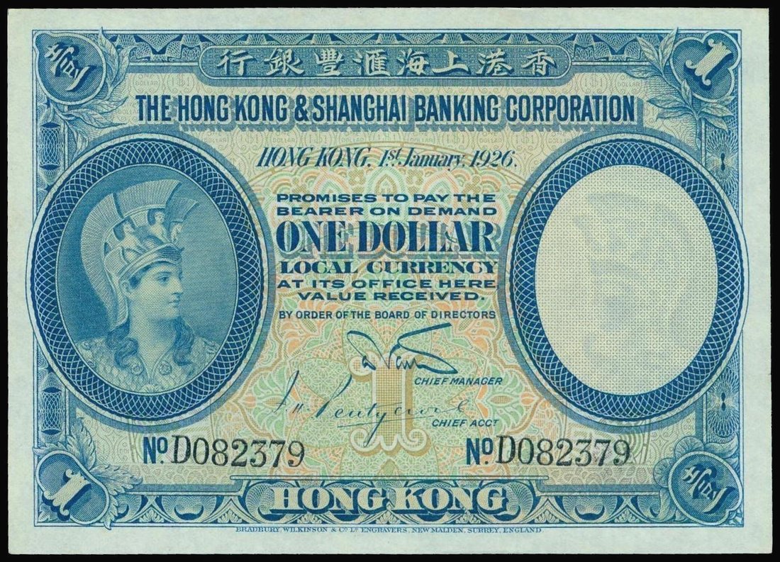 The HongKong and Shanghai Banking Corporation, $1, 1.1.1926, serial number D082379, blue and multicoloured, helmeted head of Minerva at left, two printed signatures below, reverse purple, maiden centre,
