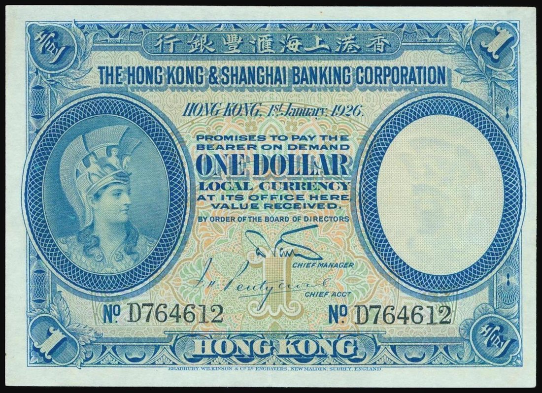 The HongKong and Shanghai Banking Corporation, $1, 1926, serial number D764612, blue and multicoloured, helmeted head of Minerva at left, two printed signatures below, reverse purple, maiden at centre,