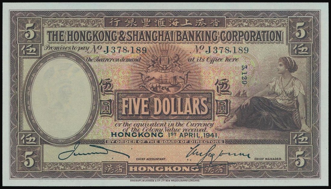 The HongKong and Shanghai Banking Corporation,$5, Duress issue, 1941, serial number J378189,with the numbers 3129 printed vertically, brown and multicoloured, reclining maiden at right, coat of arms at centre and watermark of Minerva at left, reverse brown, old HSBC building at centre,