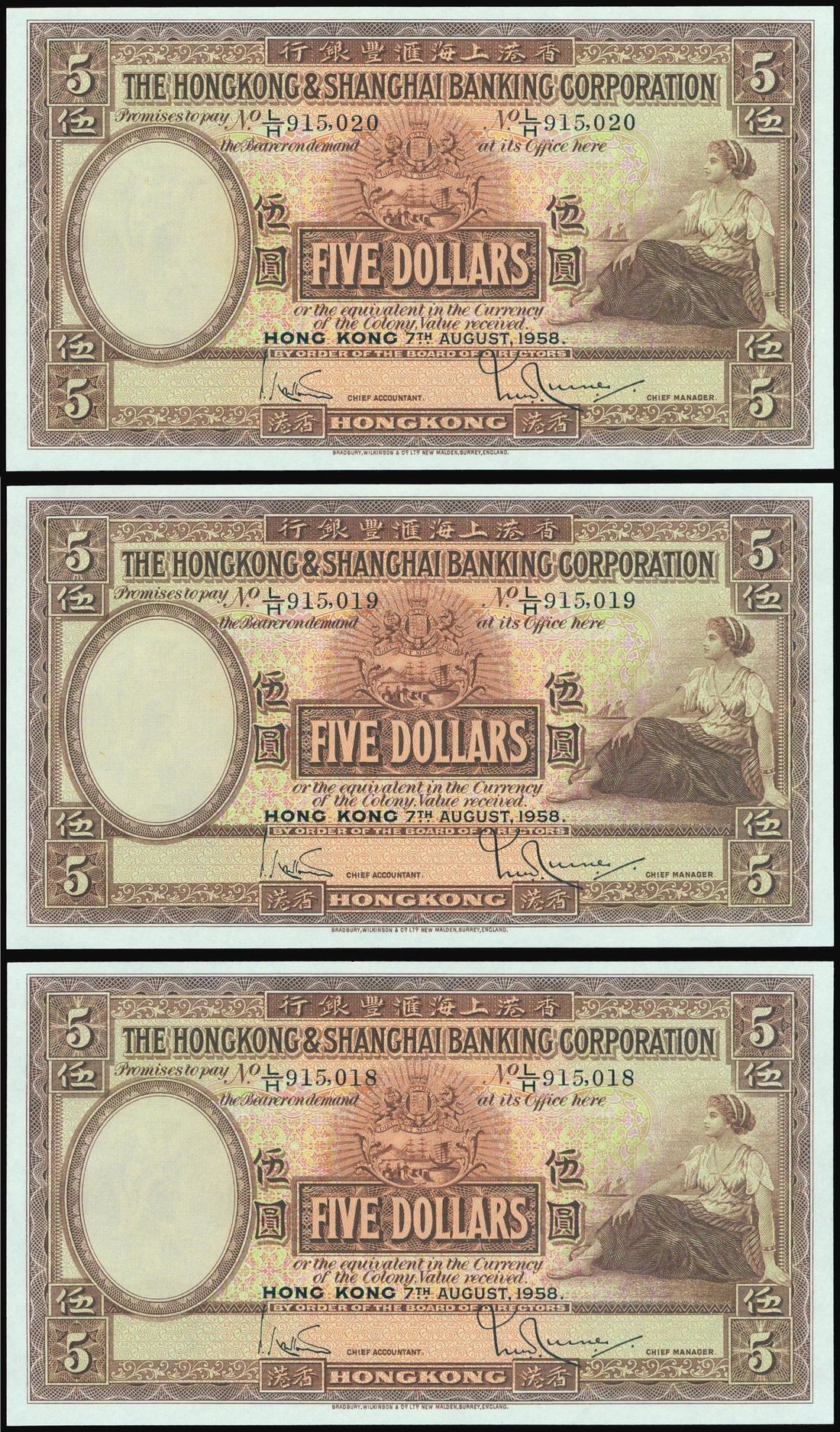 The HongKong and Shanghai Banking Corporation, consecutive trio of $5, 1958, serial numbers L/H 915018 to 020, brown and multicoloured, reclining maiden at right, coat of arms at centre and watermark of Minerva at left, reverse brown, old HSBC building at centre,