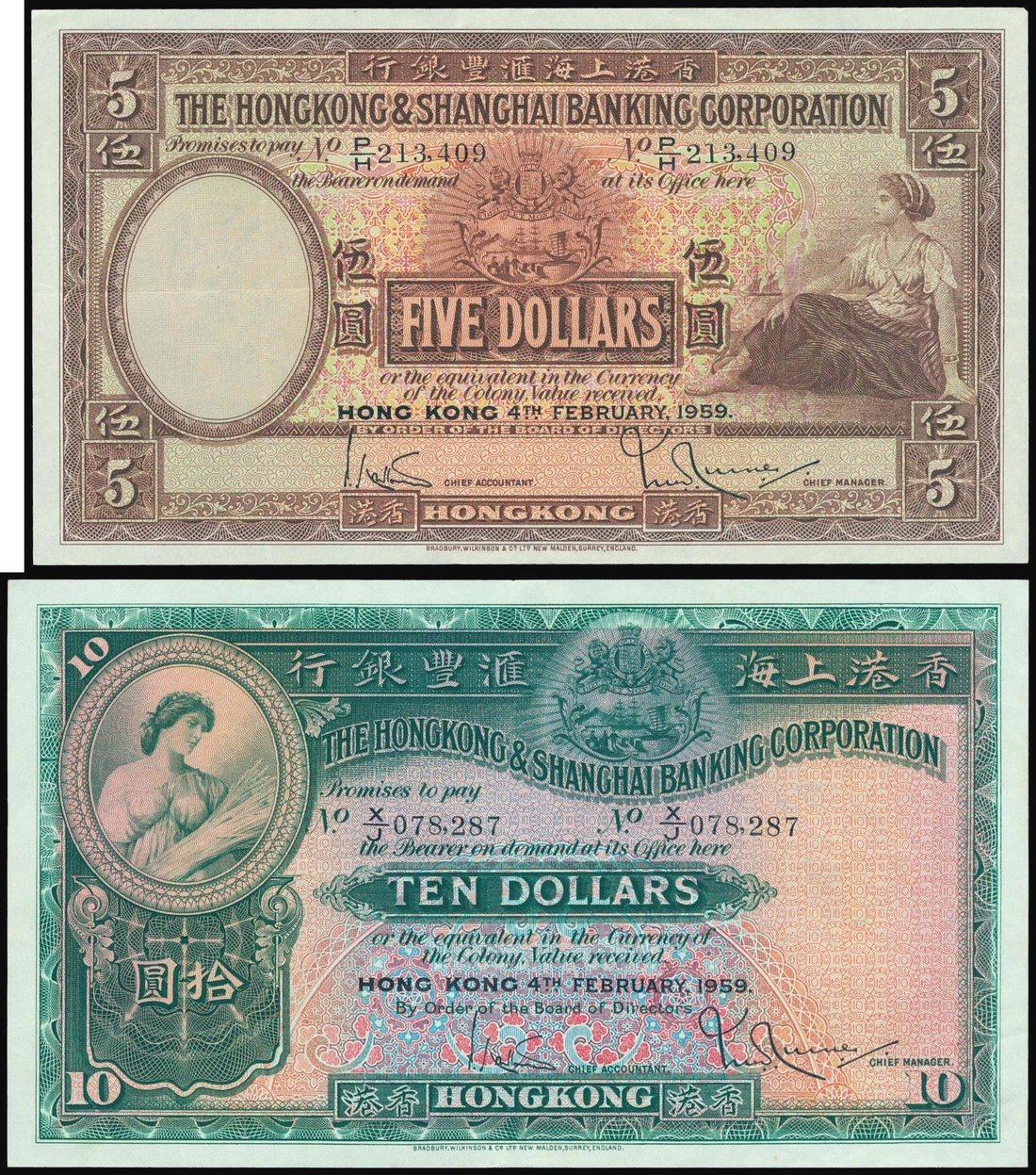 Hong Kong and Shanghai Banking Corporation,a lot of $5 and $10, 4 Feburary 1959, serial number P/H213409 and X/J078287 respectively,brown and green on multicolour underprint respectively,