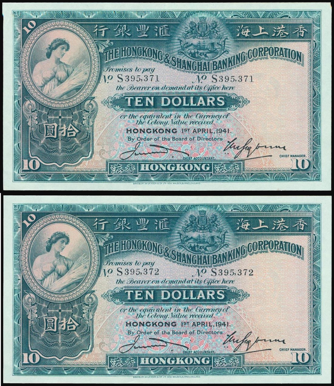 Hong Kong and Shanghai Banking Corporation,consecutive pair of $10, 1 April 1941, serial number S395371-2,green on multicolour underprint, Ceres top left, arms right of top centre, reverse green and multicolour, old bank building at centre, angel playing trumpet at top,