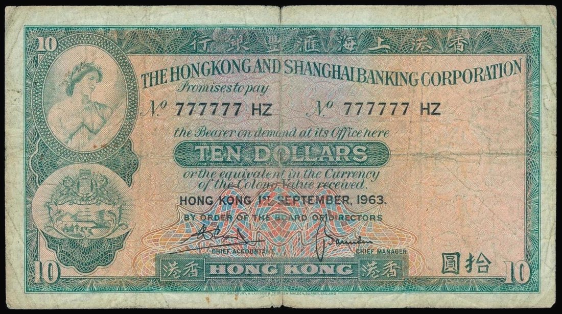 Hong Kong & Shanghai Banking Corporation,$10, 1 September 1963, solid serial number 777777 HZ,green on multicolour underprint, Ceres top left, arms below, reverse green and multicolour, old bank building at centre, angel playing trumpet at top,