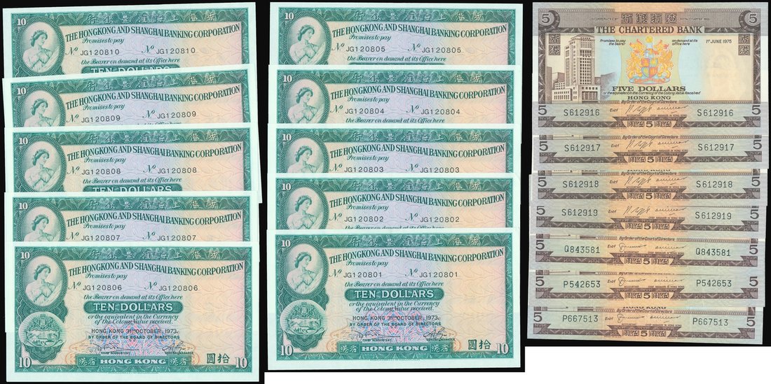 Hong Kong, lot of 17 notes consisting of: $10, HSBC, 1973, serial numbers JG120801 to 810 (10), Chartered Bank $5, 1975, serial numbers S612916 to 919 (4), and also no date (3), (Pick 182g, 73b and 73a), extremely fine to uncirculated (17).