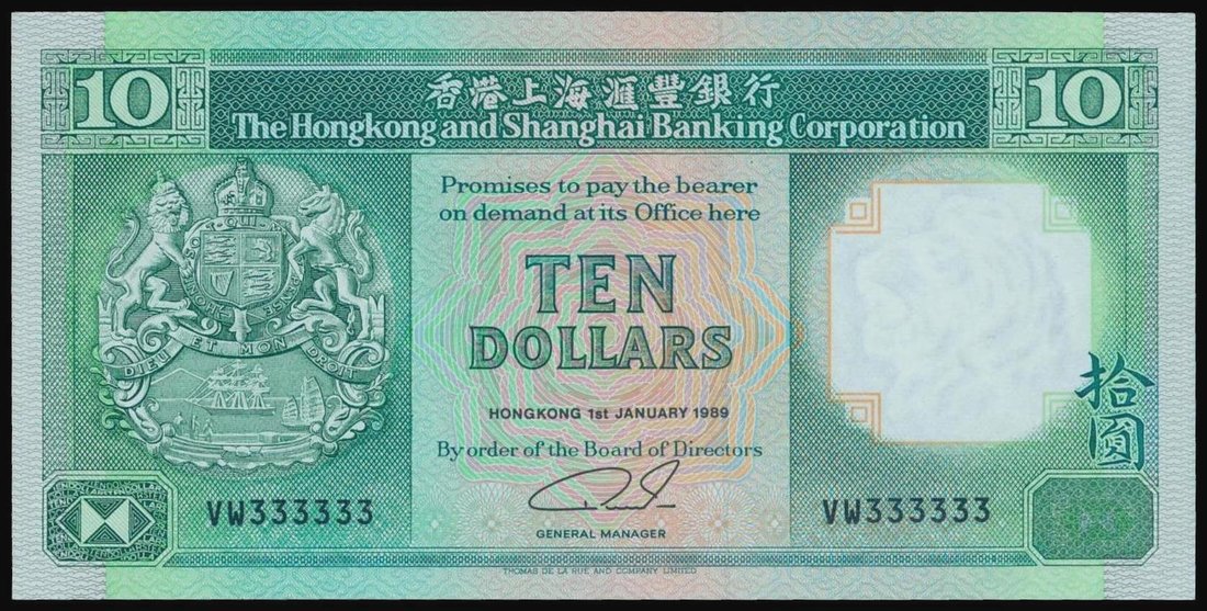 The Hongkong and Shanghai Banking Corporation, $10, 1898, lucky serial number VW333333, green on multicoloured underprint, coat of arms at left, watermark of a lion at right, reverse green, two lions flanking the HSBC building,