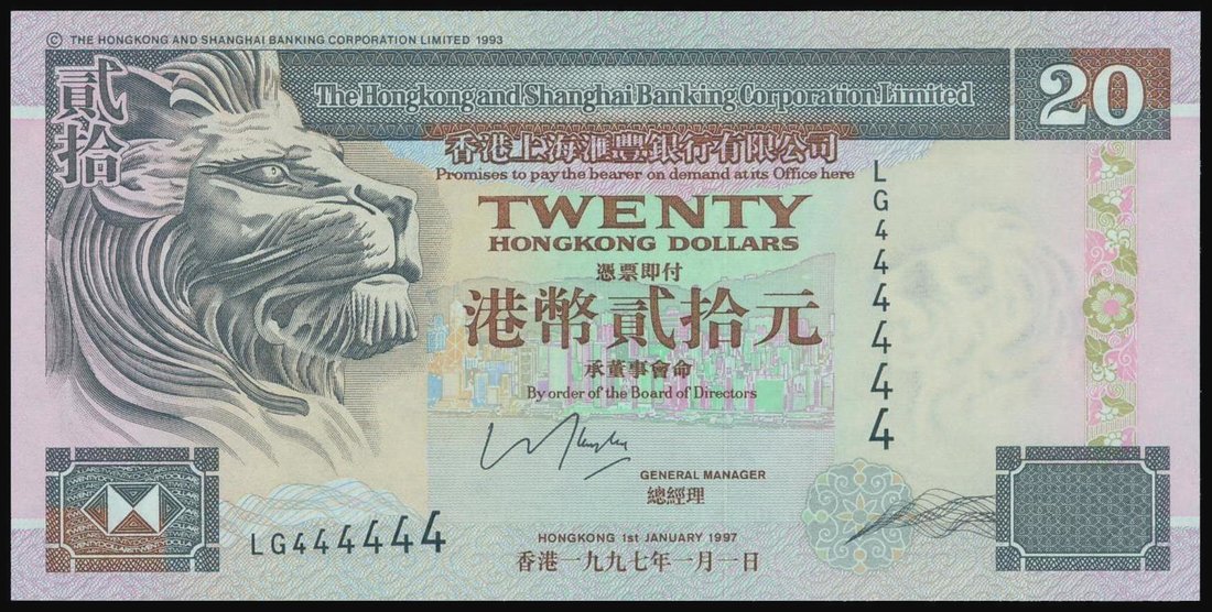 The Hongkong and Shanghai Banking Corporation, 1997, lucky serial number LG444444, grey-green and multicolour, profile of a lion at left, view of Victora Harbour at centre, lion watermark, HSBC building and Star Ferry boat on reverse,