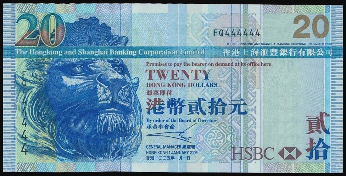 The Hongkong and Shanghai Banking Corporation, $20, 2005, lucky serial number FQ444444, blue and multicolour, three quarter profile of a lion at left,