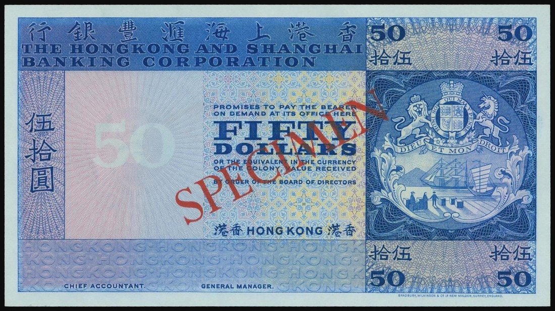 The HongKong and Shanghai Banking Corporation,$50, specimen, no date (type of 1968 to 1982),blue, coat of arms at right, watermark of a helmeted warrior at left, reverse blue, bank building at left, geometric design at right,