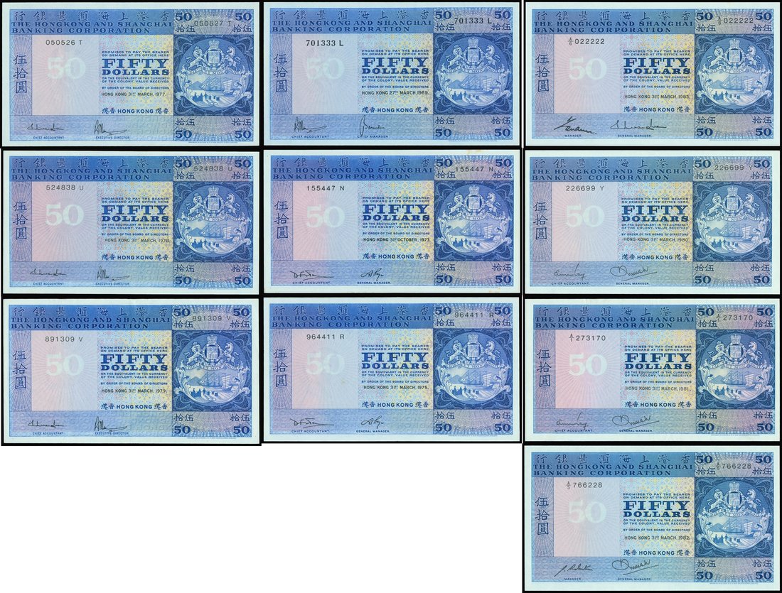 The HongKong and Shanghai Banking Corporation, near complete type set, with all dates from 1969 to 1983, including the 1979 key date blue, coat of arms at right, watermark of a helmeted warrior at left, reverse blue, bank building at left, geometric design at right,