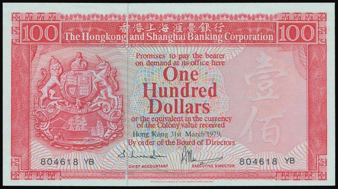 The HongKong and Shanghai Banking Corporation, $100, 1979, serial number 804618 YB, gutter fold error on the reverse,