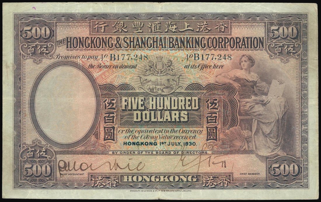 The HongKong and Shanghai Banking Corporation, $500, 1.7.1930, serial number B177248, dark brown on purple and multicolour underprint, seated maiden with a tablet at right, bank crest at centre, old HSBC building and angel on reverse, two handsigned signatures,