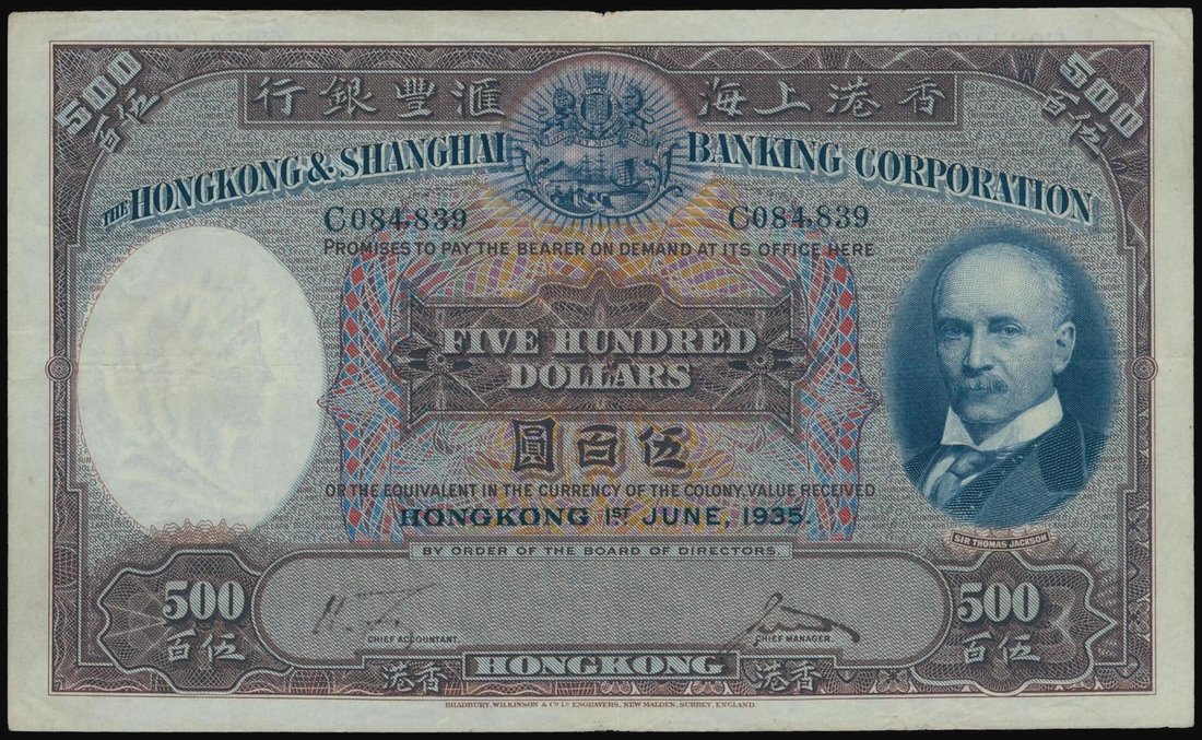 The HongKong and Shanghai Banking Corporation,$500, 1935, serial number C084839,brown, blue and multicoloured, Sir Thomas Jackson at right, coat of arms top centre, watermark of a woman in classical style at left, reverse blue, bust of woman at left and old HSBC building at centre,