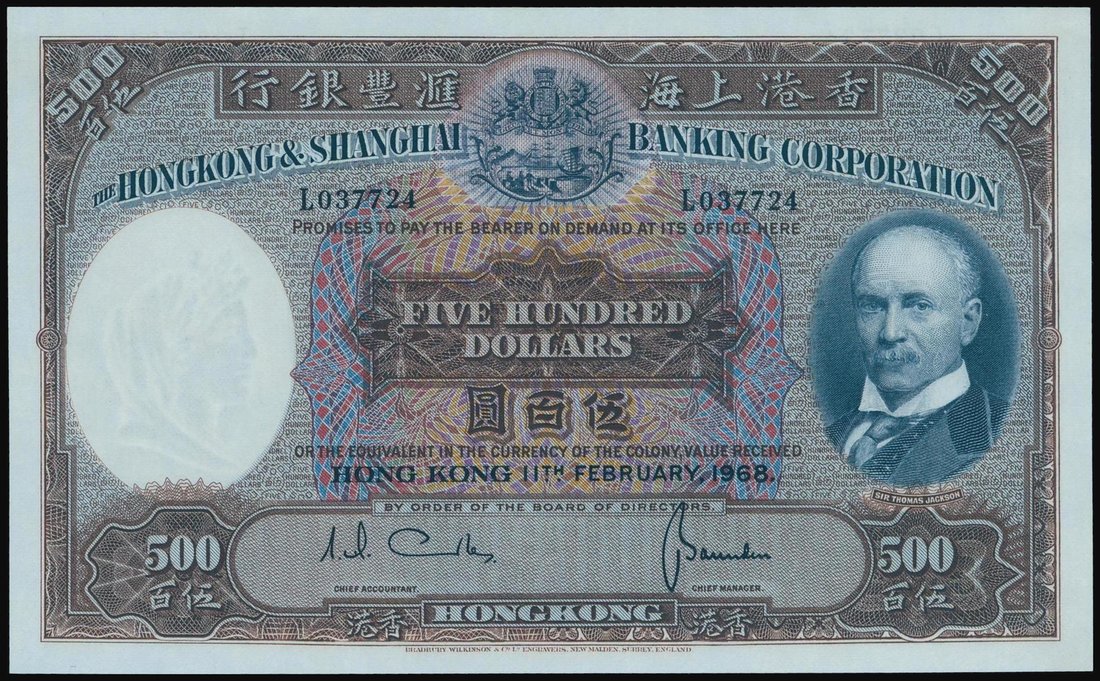 The HongKong and Shanghai Banking Corporation,$500, 1968, serial number L037724,brown, blue and multicoloured, Sir Thomas Jackson at right, coat of arms top centre, watermark of a woman in classical style at left, reverse blue, bust of woman at left and old HSBC building at centre,