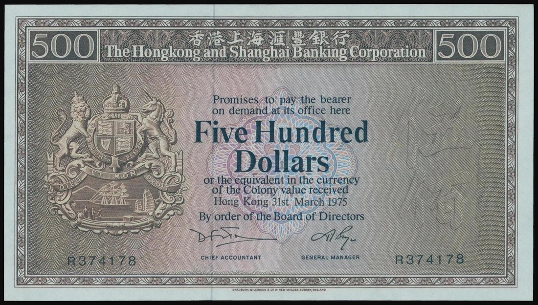 The HongKong and Shanghai Banking Corporation, $500, 1975, serial number R374178, brown and multicoloured, vignette at centre, coat of arms at right, 'Five Hundred' in Chinese characters, watermark of a lion, reverse brown, lion facing the HSBC building,