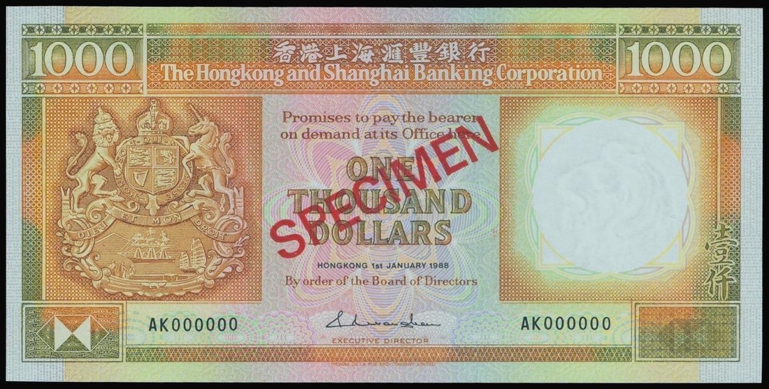 The HongKong and Shanghai Banking Corporation, $1000, specimen, 1988, serial number AK000000, orange, green and multicolour, bank crest at left, lion watermark at right,