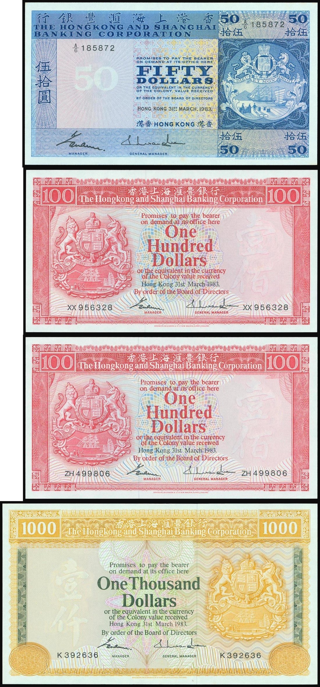 The HongKong and Shanghai Banking Corporation, $50, $100 (2) and $1000, all dated 1983, (Pick 184h, 187d and 190e), the first three notes uncirculated, the $1000 almost uncirculated (3).