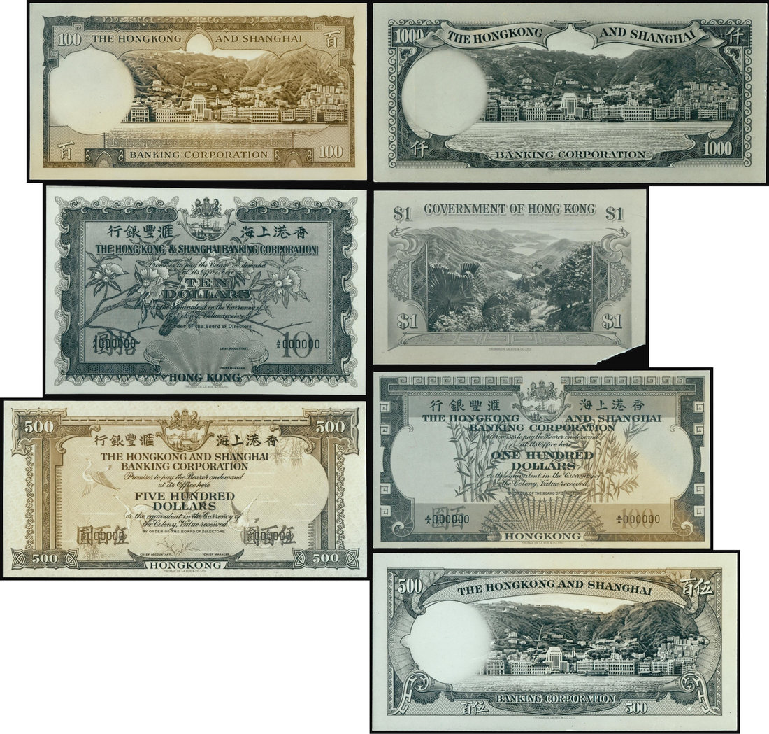The HongKong and Shanghai Banking Corporation, group of archival photographic proofs of $10 (uniface obverse), $100 (uniface obv and rev), $500 (uniface obv and rev), $1000 (uniface reverse), also Government of Hong Kong $1 (uniface reverse), all dated on the back as to when the photos were taken (mid 1950's), none of these designs were ever issued or even seen,