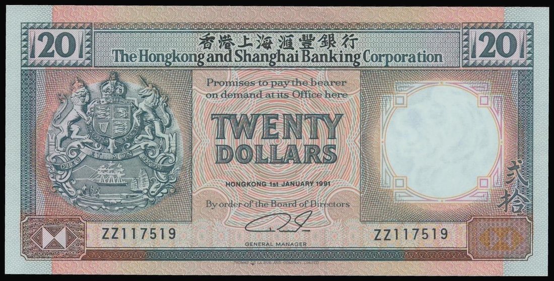 Hong Kong & Shanghai Banking Corporation,$20, 1 January 1991, replacement, serial number ZZ117519,orange and grey, arms at left, watermark at right, reverse orange and grey, two lions flanking the bank building,