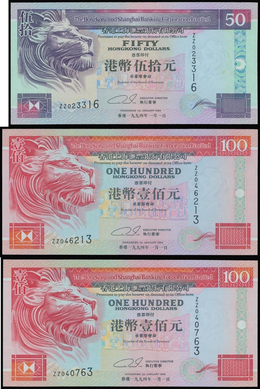 Hong Kong & Shanghai Banking Corporation,a lot of $50, $100(2) replacement notes, 1994, serial number ZZ023316, ZZ046213 and ZZ040763,gray-blue and red on multicolour underprint respectively, similar design, lion head at top left, reverse gray-blue, red, two lions flanking bank building at centre,