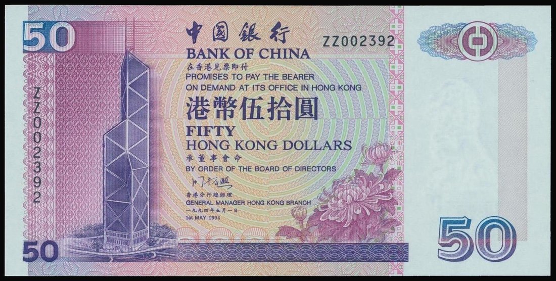 Bank of China,$50, replacement, 1994, serial number ZZ002392,purple on multicolour underprint, bank building at left, reverse purple, view of harbour and tunnel,
