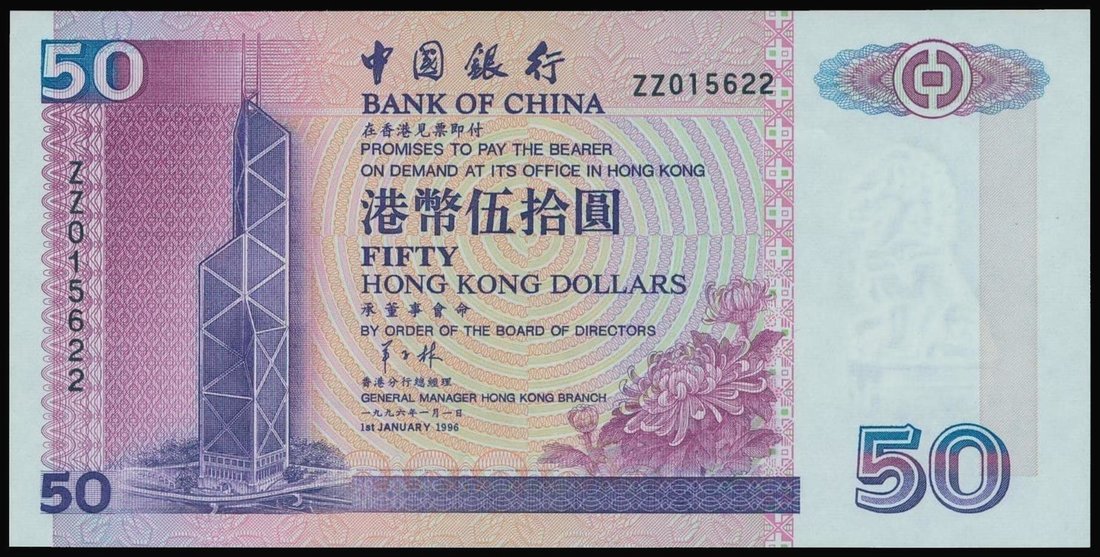 Bank of China,$50, replacement, 1996, serial number ZZ015622,purple on multicolour underprint, bank building at left, reverse purple, view of harbour and tunnel,