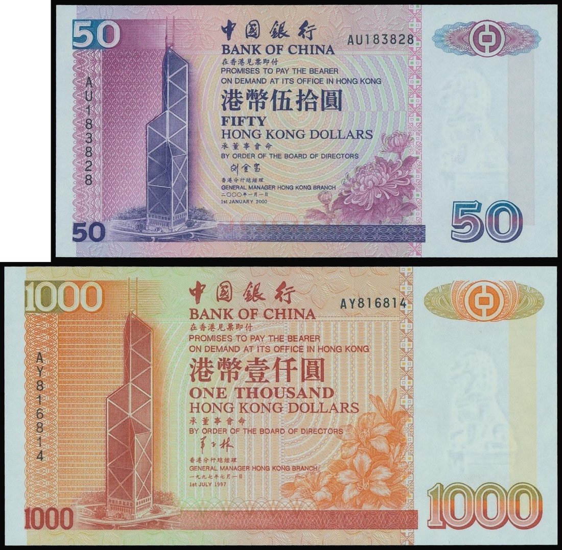Bank of China,a lot of $50, 1 January 2000 and $1000, 1 July 1997, serial number AU183828 and AY816814,purple, orange on multicolour underprint, similar design, bank building at left, reverse purple and orange respectively,