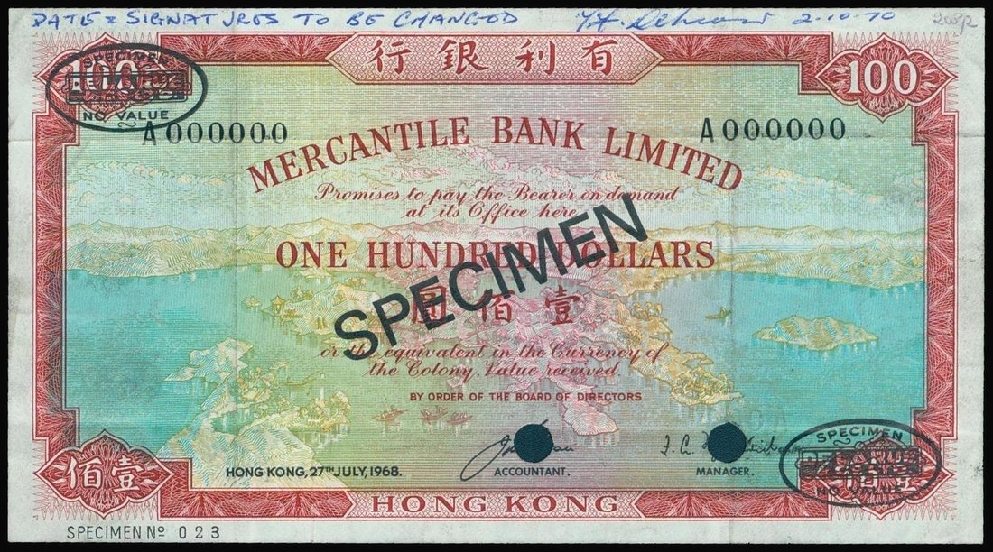 Mercantile Bank, $100, specimen, 1968, serial number A000000, red, green and blue, view of Hong Kong Island at centre, reverse red and yellow, Britannia holding at spear at centre,