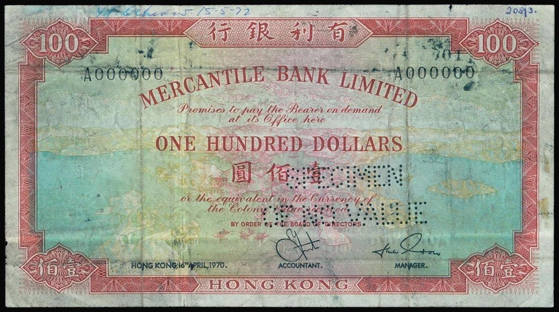 Mercantile Bank, $100, specimen/proof, 1970, serial number A000000, red, green and blue, view of Hong Kong Island at centre, reverse red and yellow, Britannia holding at spear at centre, perforated 'SPECIMEN OF NO VALUE',