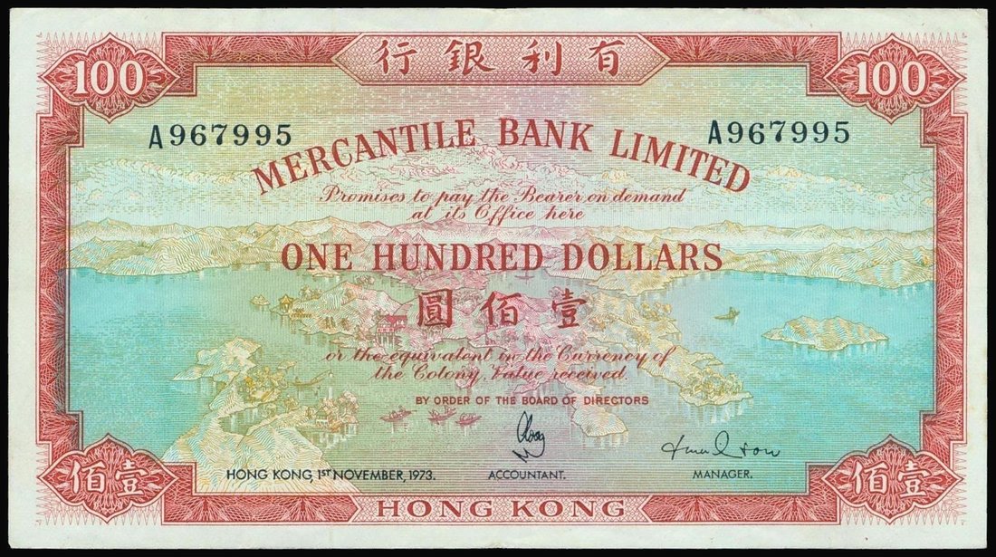 Mercantile Bank Limited, $100, 1973, serial number A967995, red, green and blue, view of Hong Kong Island at centre, reverse red and yellow, Britannia holding at spear at centre,