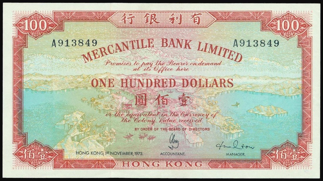 Mercantile Bank,$100, 1 November 1973, serial number A913849,red and multicolour, view of Hong Kong at centre, reverse red, Britannia at centre, value at each corner,