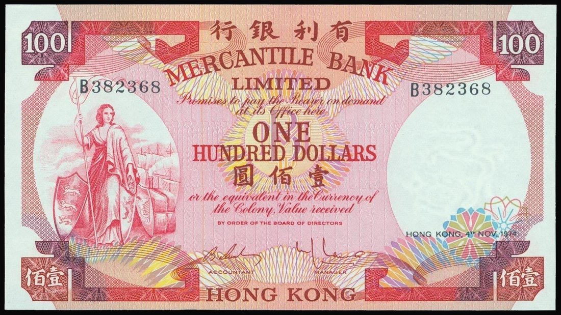 Mercantile Bank Limited, $100, 1974, serial number B382368, red and multicolour, Britannia holding a spear at left,