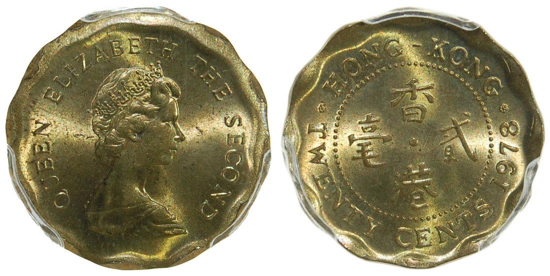 Hong Kong, MINT ERROR, brass 20 cents, 1978, Impaired scalloped edge,