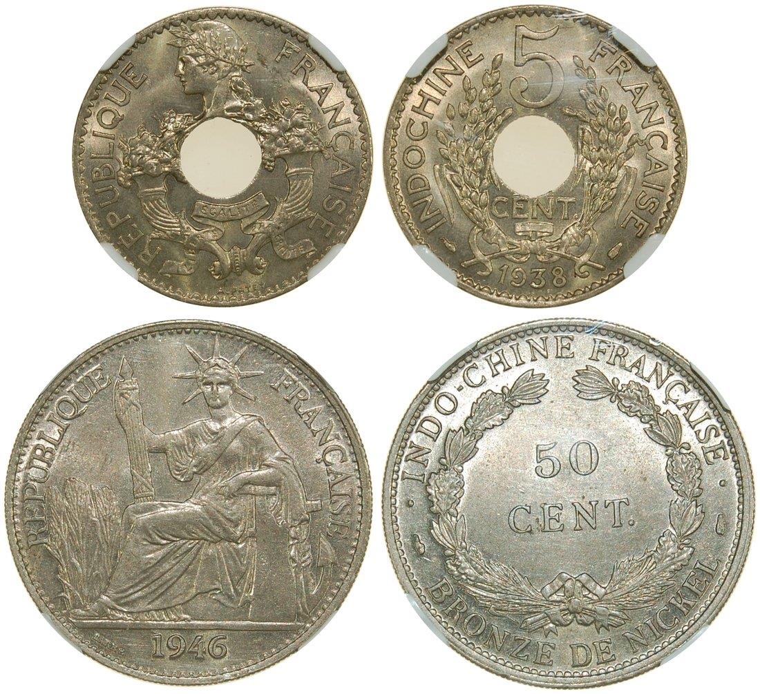 French Indo China,copper nickel 5 cents and 50 cents, 1938 and 1946,