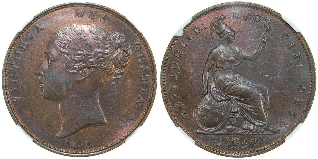 Great Britain,copper penny, 1853,‘Ornamental Trident’,