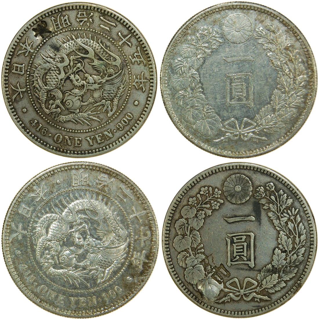 Japan, lot of 2x silver one yen, 1892 and 1894, dragon within a beaded circle on obverse, the reverse shows the value within wreath, chrysanthemum emblem,