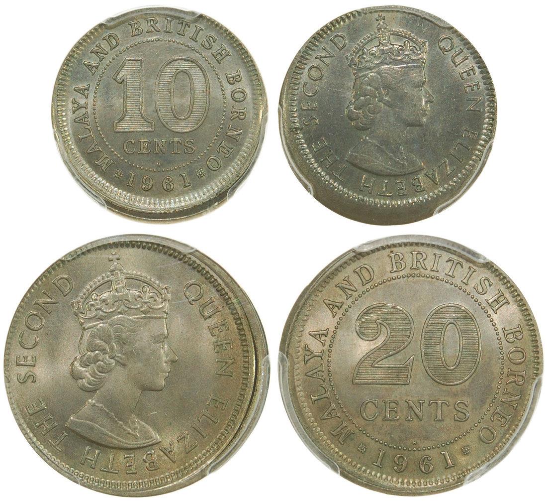 Malaya & British Borneo,copper nickel 10 and 20 cents, 1961-H, both mint error, Elizabeth II on obverse, the 10 cents uncentered broadstrike, the 20 cents partial collar strike,