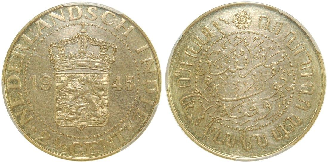 Netherlands Indies, 2.5 cents, gold pattern, 1945, Dutch coat of arms and date on obverse, Arabic script on the reverse,