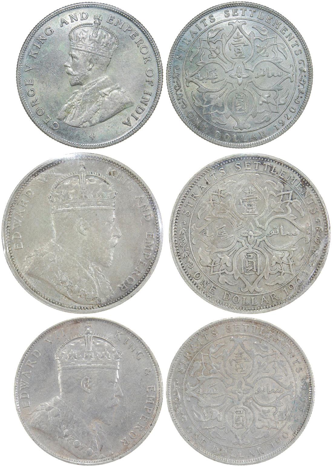Straits Settlements, lot of 3x silver dollars, 1903, 1907 and 1920,