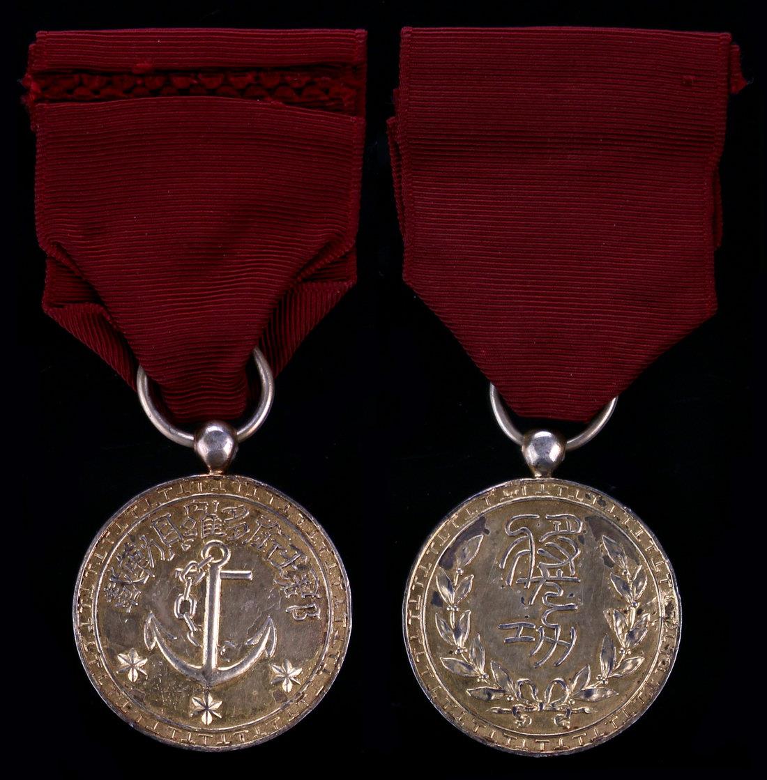 Medal for Imperial Navy by Prince Rui, Zaixun,gilt silver medal with dark purple ribbon, anchor at centre, three stars below, title of Prince Zaixun in Chinese at top, reverse two Chinese calligraphy characters at centre of wreath,