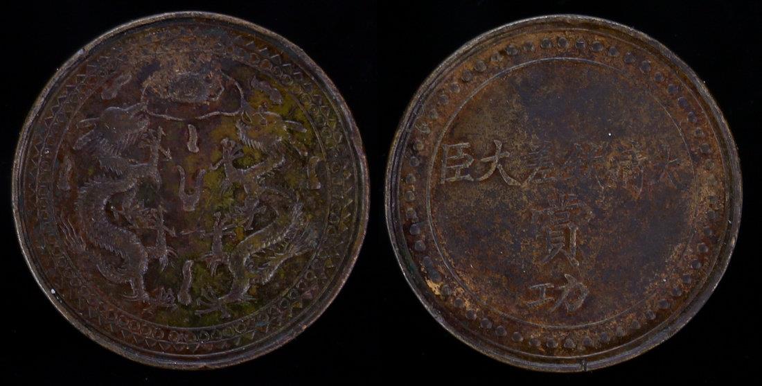 Merit Medal Awarded by the Imperial Envoy,bronze, two facing dragons on obverse, reverse Chinese characters, late Qing dynasty,