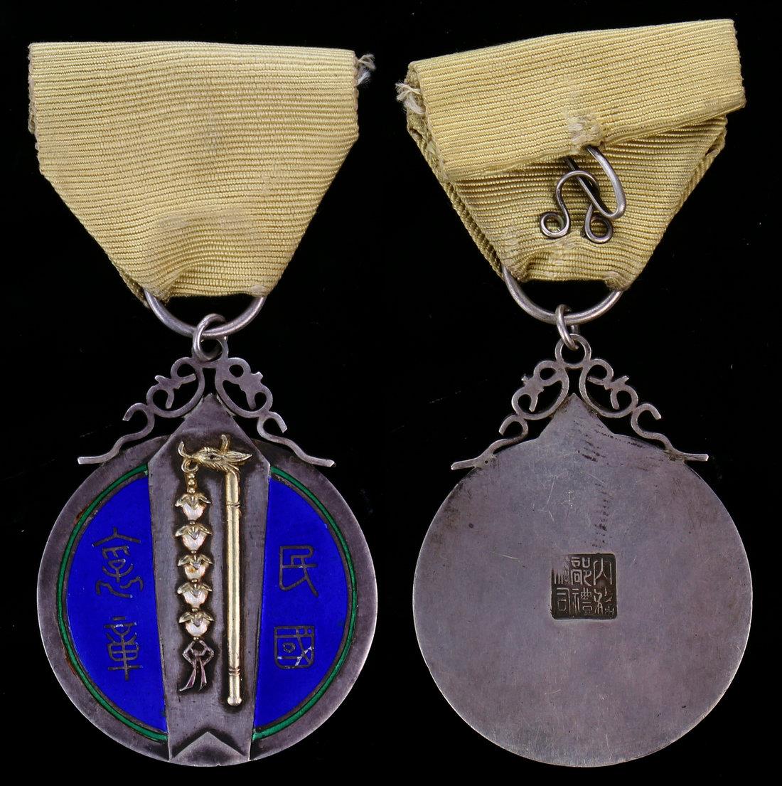 The Republican Merit Medal,silver, blue and green enamel, with ribbon, stick at centre, Chinese characters left and right, hallmark at centre on reverse,