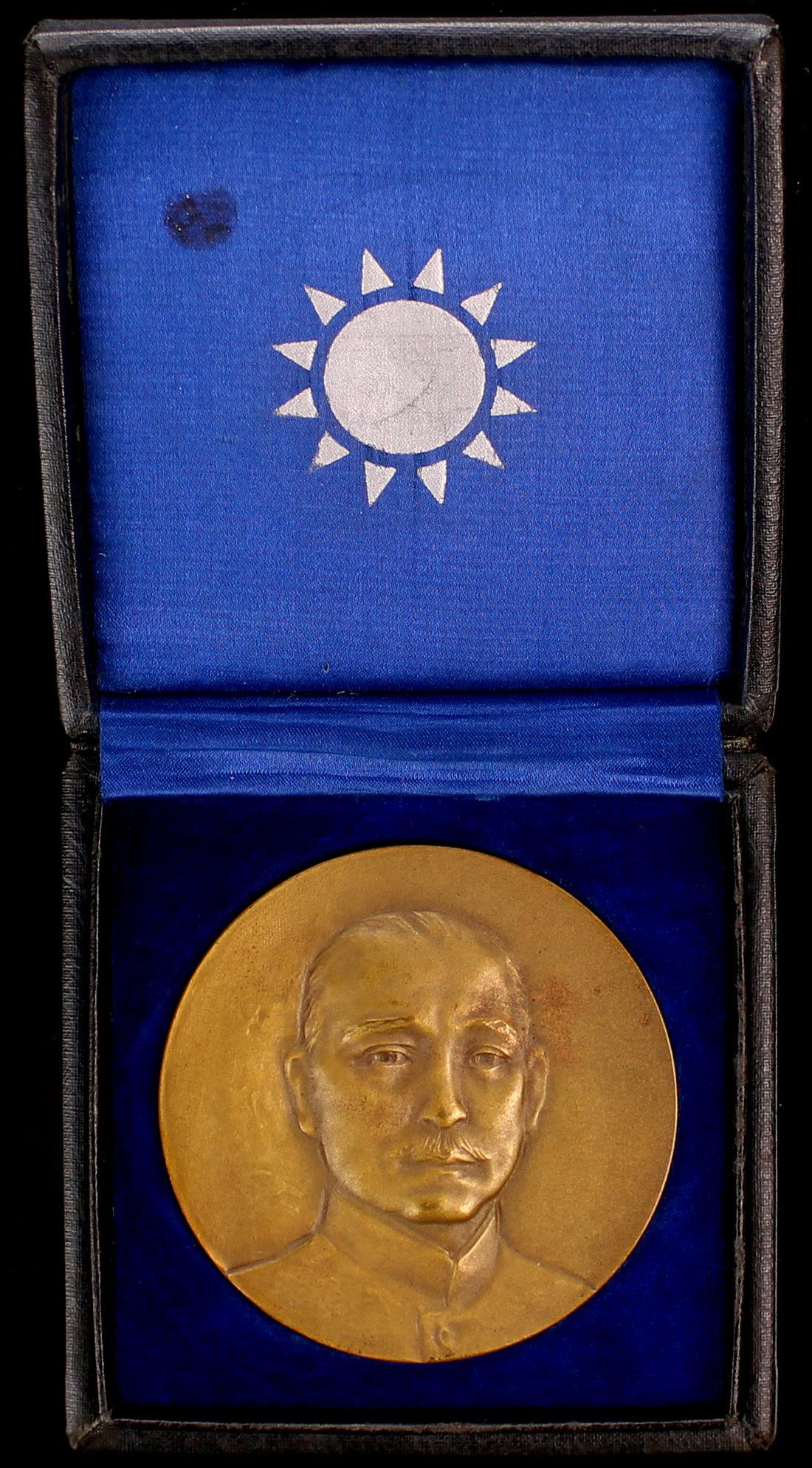 The Commemorative Medal of the Burial of Sun Yat Sen,large bronze medal, bust of Sun Yat Sen on obverse, mausoleum on reverse, Chinese text and date at top left and right, inscribed serial number 8169 and manufacturer on edge,